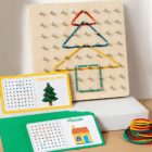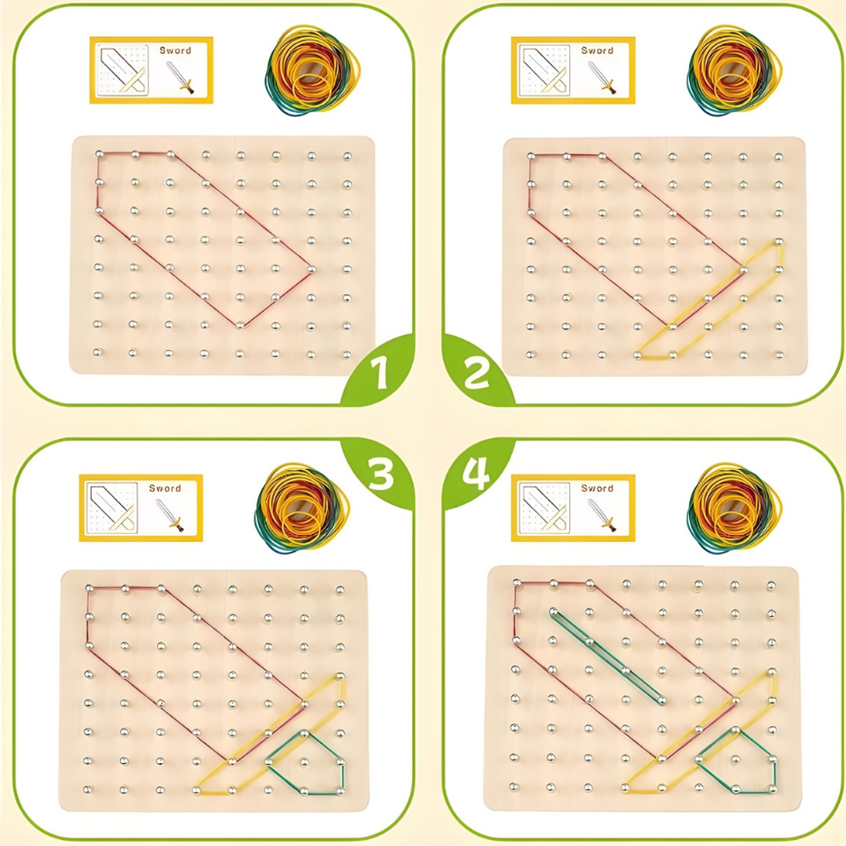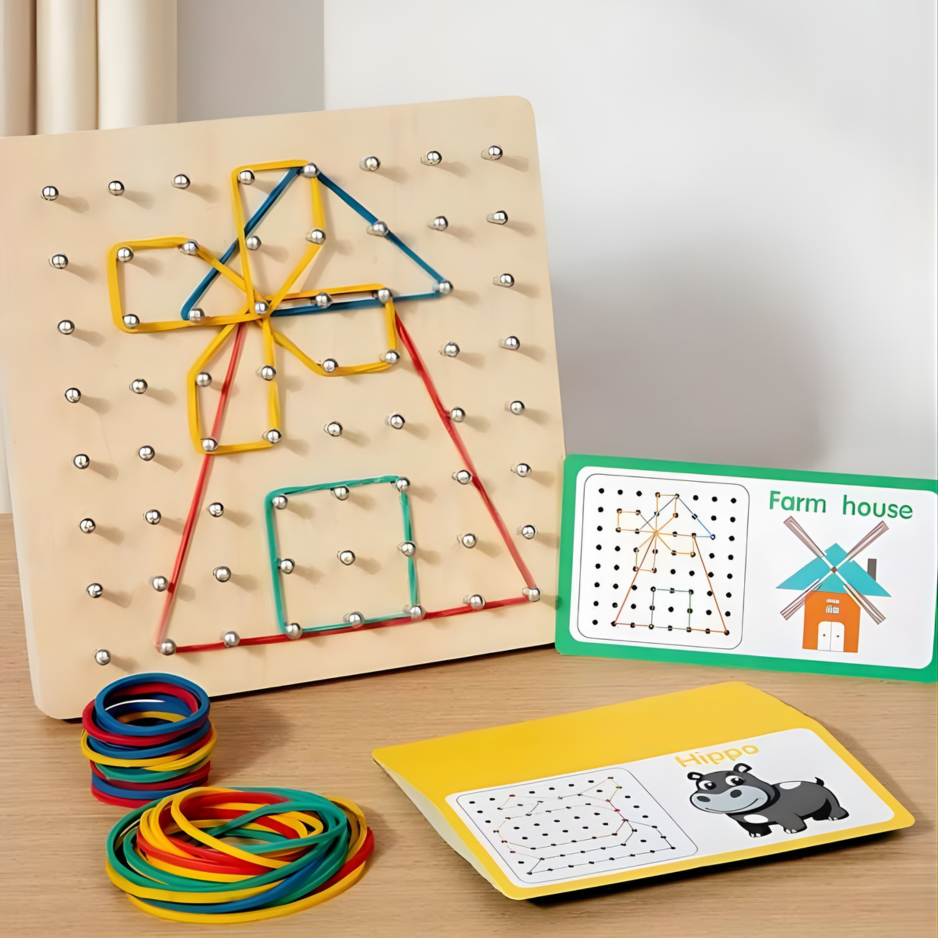 • 🧩 Rodzaj: Drewniana układanka z gumkami