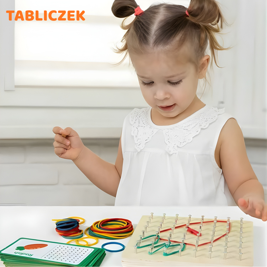 Kolorowe karty z wzorami i elastyczne gumki zachęcają dziecko do tworzenia coraz to nowych kształtów. Każdy obrazek to nowe wyzwanie, które pobudza wyobraźnię i uczy cierpliwości.