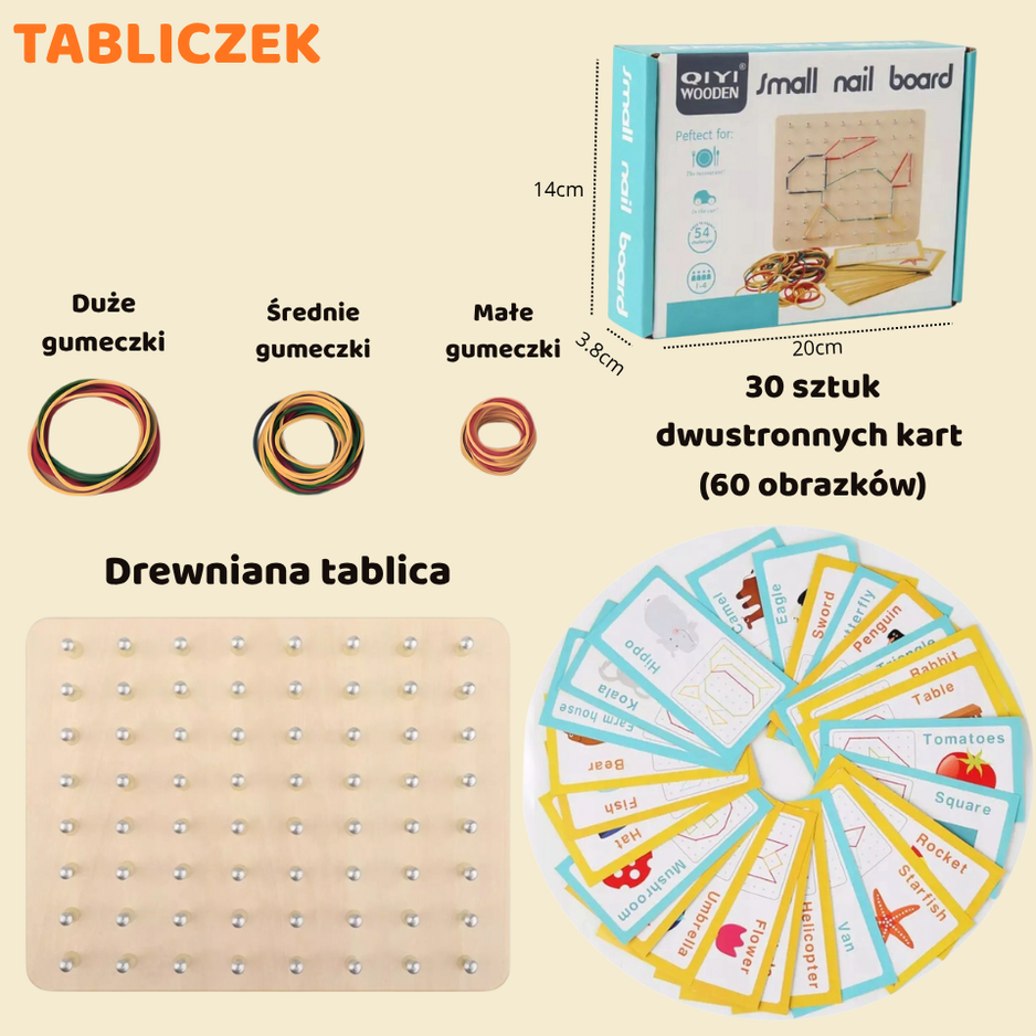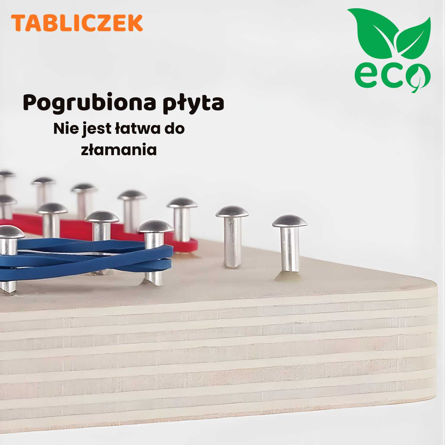• 🧩 Rodzaj: Drewniana układanka z gumkami